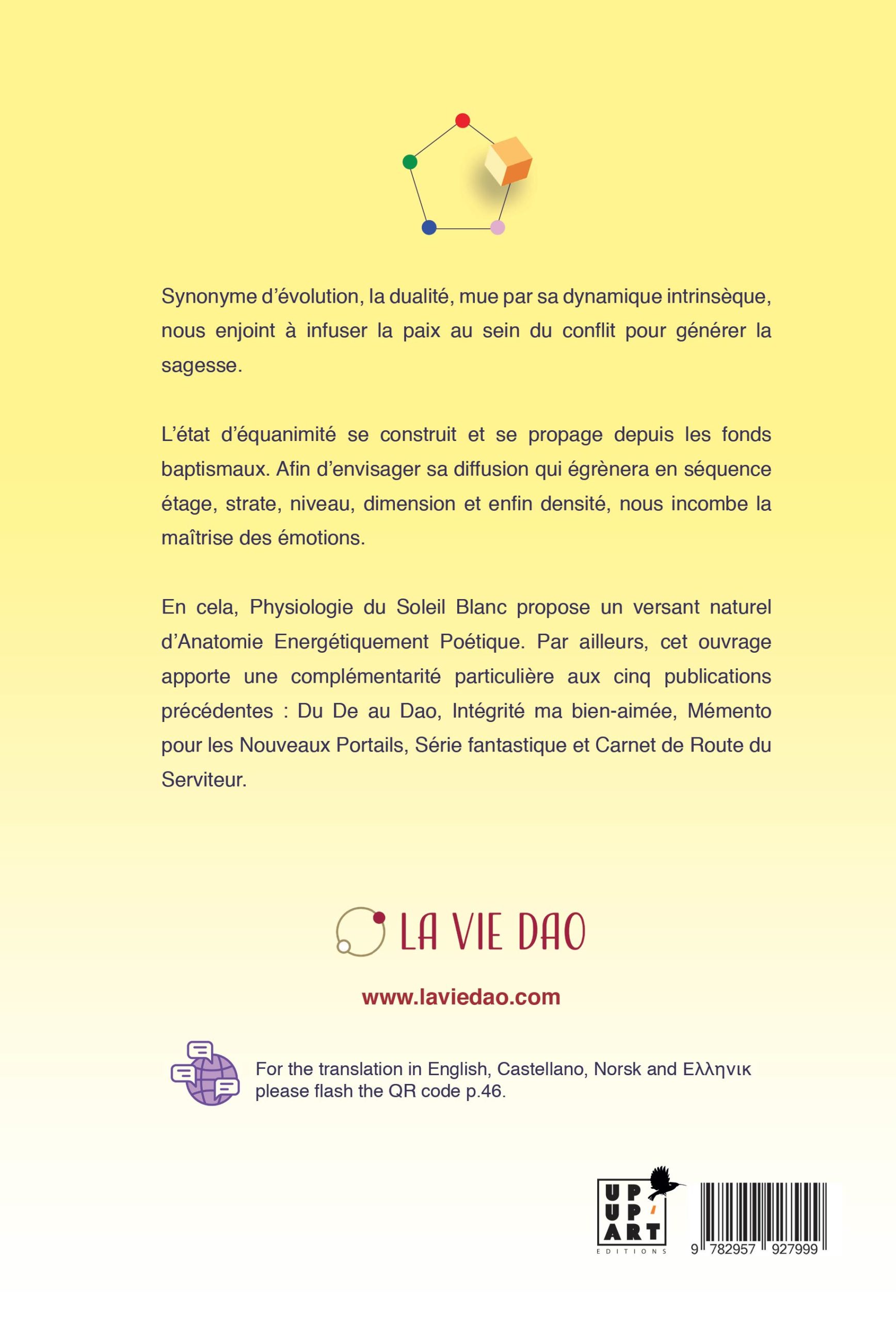En cela, Physiologie du Soleil Blanc propose un versant naturel d’Anatomie Energétiquement Poétique. Par ailleurs, cet ouvrage apporte une complémentarité particulière aux cinq publications précédentes : Du De au Dao, Intégrité ma bien-aimée, Mémento pour les Nouveaux Portails, Série fantastique et Carnet de Route du Serviteur.